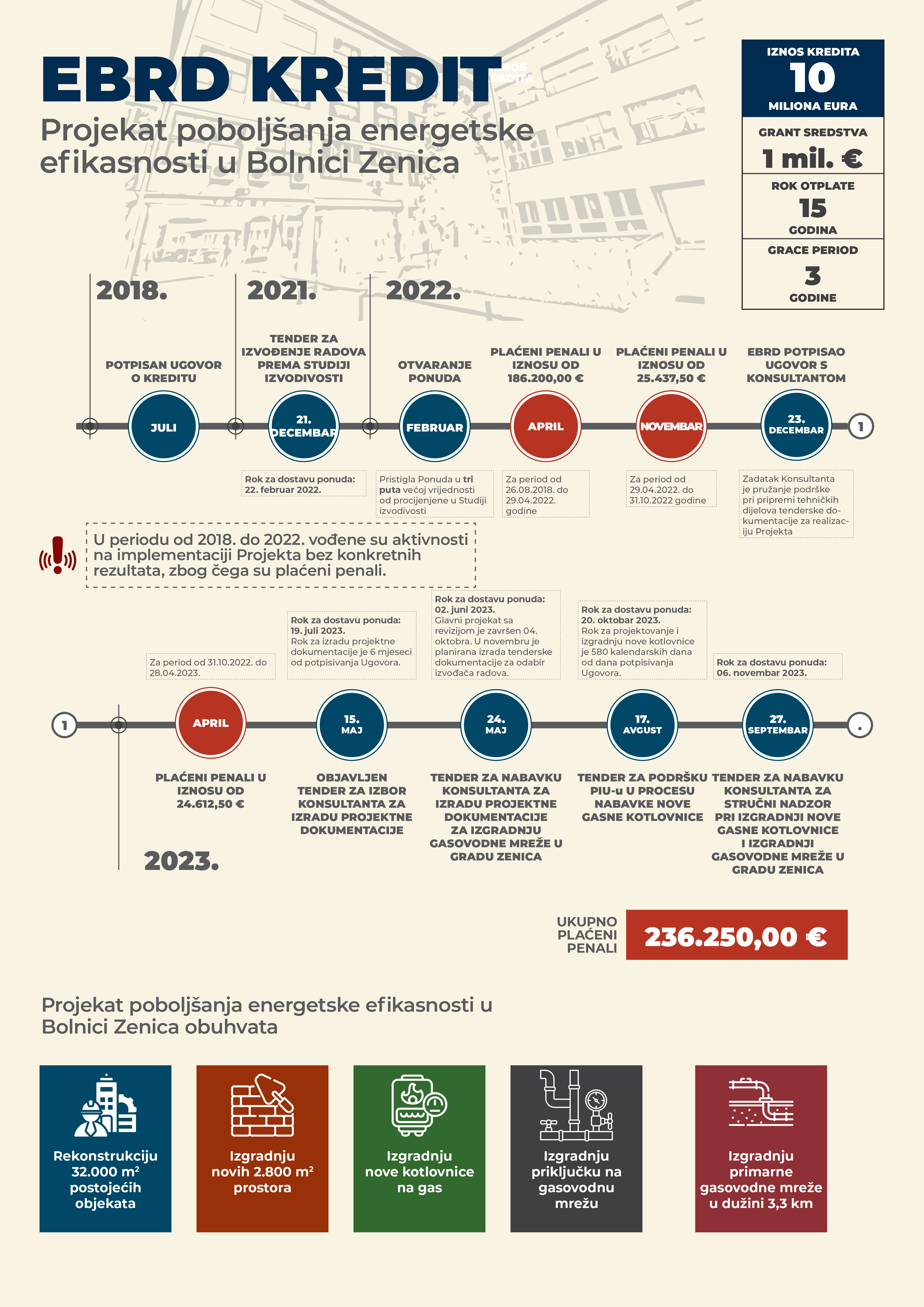 Vlada u prethodnom sazivu i bivša uprava Kantonalne bolnice vodile su aktivnosti na implementaciji projekta bez konkretnih rezultata zbog čega su u periodu od 26.08.2018. do 28.04.2023. godine plaćene takse/penali na nepovučena sredstva po osnovu kredita EBRD-a u ukupnom iznosu od 236.250,00 EUR odnosno 462.064,84 KM.