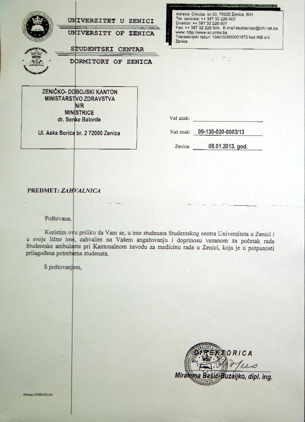 Studentski centar Univerziteta u Zenici, na čelu sa direktoricom Miralemom Bašić- Buzaljko, uputio je zahvalnicu ministrici zdravstva ZDK Senki Balorda „na angažmanu i doprinosu vezanom za početak rada Studentske ambulante pri Kantonalnom zavodu za medicinu rada u Zenici, koja je u potpunosti prilagođena potrebama studenata.“